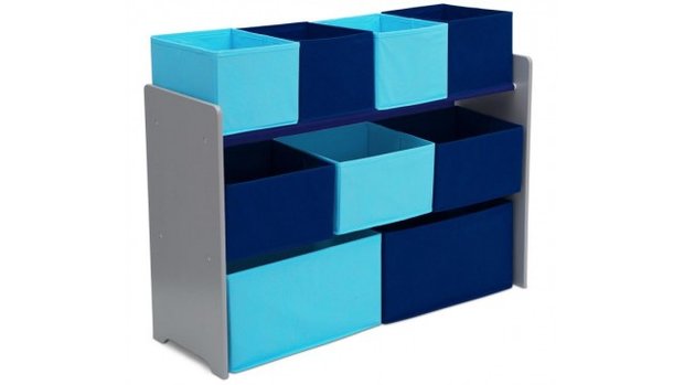 Mooie speelgoed opbergkast voor de kinderkamer Deze houten opbergkast heeft een stevig MDF frame. Met 9 canvas manden in verschillende formaten. Afmeting LxBxH: ca. 90 x 30 x 69 cm Kleuren: donkerblauw, lichtblauw en grijs. Merk: Delta Children Verzendkosten: € 4.95.